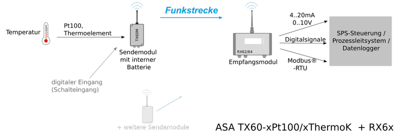 - Telemetriesystem TX40/60-xPt100 / RX4x/RX6x zur Temperaturmessung mit externen Pt100-Sensoren,